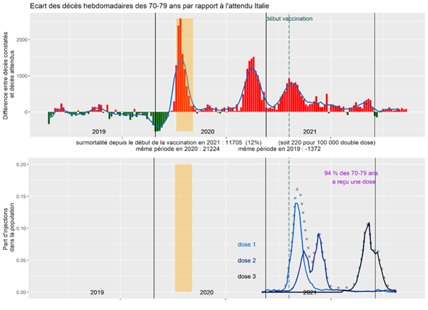 L’Italie fait partie des rares pays à avoir une surmortalité en mars-avril 2020. L’impact de l’abandon de soin dans ce pays est largement documenté. On retrouve ensuite les surmortalité à chaque campagne de vaccination.