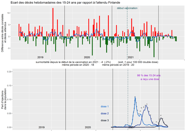 Les 15-24 ans en Finlande ont deux épisodes de surmortalité, correspondant aux 2 campagnes vaccinales distinctes de la dose 1 et de la dose 2.