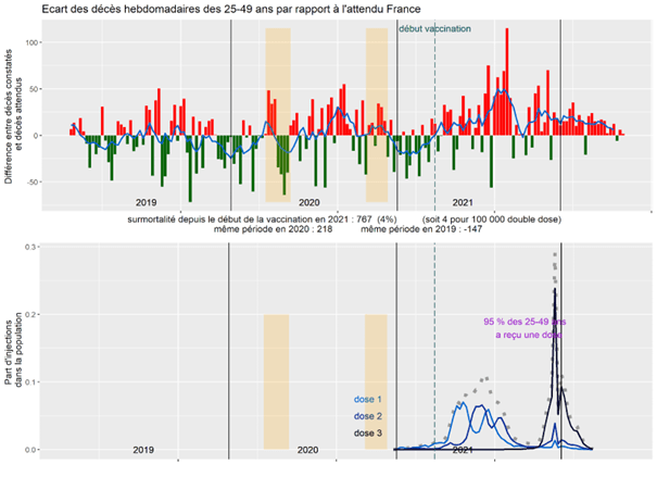 Même constat pour les 25-49 ans, avec même une nouvelle hausse de mortalité visible au moment de la campagne pour la 3e dose.
