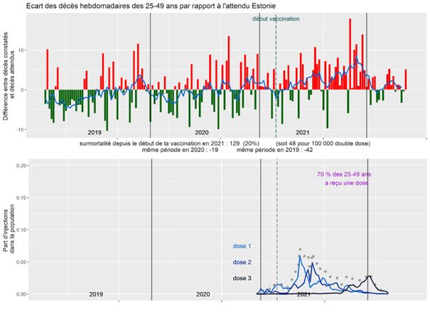 En Estonie, pour les 25-49 ans, on observe une surmortalité qui arrive à partir de la première campagne de vaccination et qui ne redescend plus.