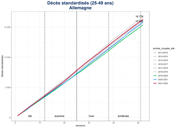 Nous faisons le même constat pour les 24-49 ans. En France, comme dans 12 pays, l’année de juillet 2021 à juin 2022 est la plus mortelle des 3 dernières années et sort de la tendance récente.