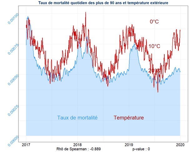 Pour mémoire, nous avons montré que la mortalité hivernale des personnes âgées n’est absolument pas liée à un phénomène de propagation épidémique. Il n’y a aucune propagation puisque tous les pays d’Europe ont la même hausse de mortalité en même temps. C’est également vrai au sein de chaque pays : chaque région voit sa hausse de mortalité au même moment. Rien ne se propage. Nous avons également montré que cette hausse de mortalité des personnes âgées correspond parfaitement à la baisse des températures. L’arrivée du froid est donc parfaitement corrélé à la hausse de la mortalité.