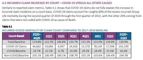 Outre Atlantique, on s’alarme également de hausses de mortalité inexpliquées malgré tous les bienfaits des mesures sanitaires et des vaccins sûrs et efficaces. Le Society of Actuaries Research Institute (l’institut de recherche d’une association d’actuaires qui travaille sur les risques et les assurances) a publié une analyse en août 2022. Ils analysent le nombre de personnes demandant à toucher une assurance-vie suite à un décès comparativement aux années “pré-pandémie”. Ils observent que la hausse de la mortalité depuis 2020 est plus élevée que les déclarations (pourtant très larges) de décès “dus” à la Covid-19. Pour 100 morts auparavant, il y en a eu 121 depuis la “pandémie”. Parmi les 121, 17 sont attribués à la Covid-19. Chacun est libre de croire que ces 17 font partie des 21 morts en plus, ou plutôt des 100 habituels. Quoi qu’il en soit, il en manque au moins 4.