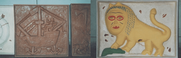 Retirages en résine de bas-reliefs : à gauche, bas-relief évoquant les conquêtes du roi Agadja, à droite, le lion représentant sous forme allégorique le roi Glélé. (Éts du Dr Auzoux).