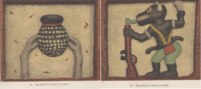 Quatre bas-reliefs du palais d’Agadja (1708-1740), bâtiment aujourd’hui disparu, Abomey, Bénin. WATERLOT, Emmanuel-Georges. Les bas-reliefs des bâtiments royaux d’Abomey. Paris : Maisonneuve (Institut d’ethnologie de Paris, Travaux et mémoires, 1), 1926, planche IV, B.