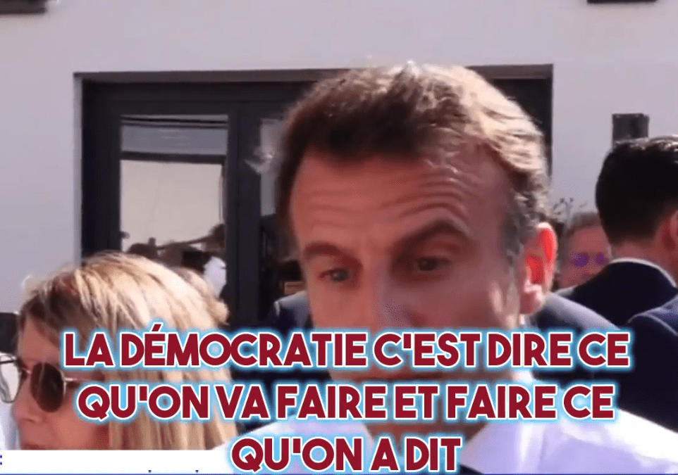Pris à parti par les manifestants qui ne veulent pas de sa loi forcée sur la retraite à 64 ans, Macron arc-bouté sur ses ergots de Monsieur je-sais-tout donne la définition suivante de la démocratie : « la démocratie c’est dire ce qu’on va faire et faire ce qu’on a dit” . Sous-entendu, il aurait prévenu les Français que la retraite à 64 ans faisait partie de son programme nonobstant quoi ceux-ci auraient voté pour lui en toute connaissance de cause.