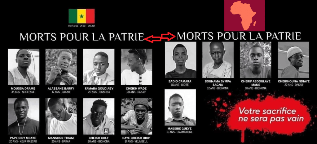Et tout ça dans le silence des médias, non seulement les médias du sanguinaire autocrate qui veut s’éterniser au pouvoir façon Françafrique (sur le modèle déposé de la Côte d’Ivoire, du Gabon, du Togo, du Cameroun, etc). Mais surtout la presse de ces grands pays amis de la démocratie et des droits de l’homme qui naguère s’étranglaient de ce que Gbagbo voulait prétendument violer la démocratie ivoirienne. Où sont ces vertueux, ces porte-voix de la raison, donneurs de leçons, pendant que les jeunes sénégalais épris de liberté et de justice se font massacrer ?