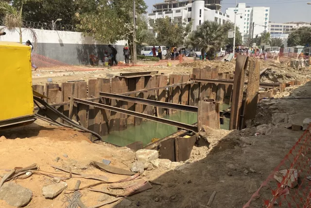 Si, début janvier 2024, au micro de Radio Futurs Médias (RFM), le recteur de l’Ucad, Ahmadou Aly Mbaye, maintenait la position selon laquelle, sept mois après la fermeture, « nous prenons des décisions en toute responsabilité [sans chercher à] être populaire, mais [pour] la sécurité de notre communauté », la réalité quotidienne se révèle bien différente. Alors que les travaux de réfection n’ont débuté que fin 2023, les artères principales de l’université se sont transformées en chantier permanent. De l’avenue Cheikh-Anta-Diop, dépassant le trottoir menant au « Couloir de la mort »7, l’on tombe sur un immense trou donnant sur l’eau stagnante d’un réseau de canalisation ouvert depuis des mois, que l’on croirait à l’abandon. Plus loin, les panneaux de signalisation encore troués et les vitres éclatées ne semblent pas avoir été intégrés dans le plan de réhabilitation.
